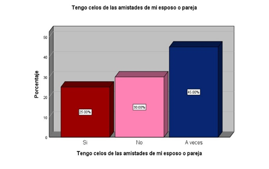 En lo que corresponde a la gráfica No.5, un 45% de las mujeres, con frecuencia presentan celos de las amistades de su pareja. Lo que refleja que son personas inseguras y con desconfianza en sí mismas; es decir que estos sentimientos encubren inseguridad e ideas de inferioridad ante la necesidad de ser amada, y que probablemente desde su infancia no tuvieron un mayor cuido y de protección. Siendo así, el otro 30% de estas mujeres dicen no sentirse celosas de las amistades de sus parejas.