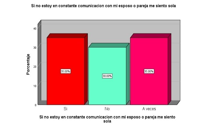 Por último, los datos reflejados en el gráfico No.6 demuestran que un 35% de las mujeres universitarias indicaron si sentirse solas si no están en constante comunicación con su pareja. Concluyendo así, son mujeres que desde su infancia no tuvieron un apoyo emocional, no fueron escuchadas lo que produce una sensación de soledad, y que hace cuestionar el sentido de la relación. Y tienen la necesidad de estar en comunicación con sus parejas para llenar un vacío afectivo.