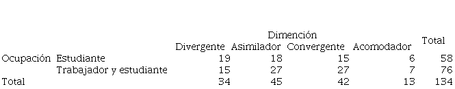 Al analizar la situación ocupacional de la muestra, descomponiendo a los alumnos entrevistados entre aquellos que estudian y trabajan, versus lo que sólo estudian, se obtiene que los estilos predominantes entre quienes estudian y trabajan es el de asimilador y convergente, en cambio en aquellos que sólo estudian se ve un predominio de divergentes y asimiladores.