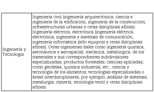 Las áreas científicas definidas por el Manual de Frascati son: (i) Ciencias Naturales; (ii) Ingeniería y Tecnología; (iii) Ciencias Médicas; (iv) Ciencias Agrícolas; (v) Ciencias Sociales; (vi) Humanidades. En la tabla 1 se muestra en detalle el área de Ingeniería y Tecnología.
