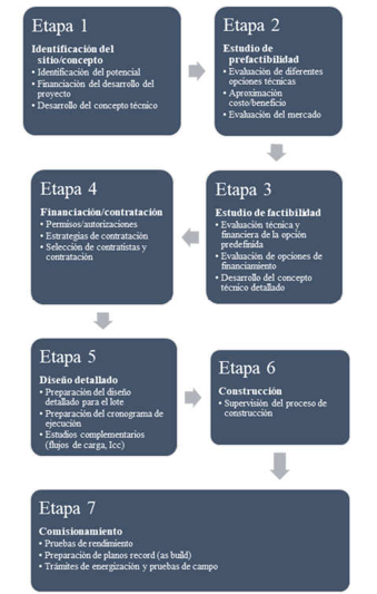En la figura 1 se presentan las principales etapas para el desarrollo de un proyecto solar fotovoltaico a gran escala, también llamado parque solar fotovoltaico [2]. Según la capacidad del parque solar fotovoltaico es posible que algunas actividades puedan ser omitidas o presentar un mayor grado de detalle. El proceso de prefactibilidad, factibilidad y diseño debe considerar los aspectos regulatorios, permisos, licencias, equipos comerciales y un balance óptimo en términos de costos y beneficios para cada sitio en específico. Adicionalmente, los diseños deben considerar la versatilidad del mercado de cada país, es decir, no todos los países tienen el acceso tecnológico y comercial de las nuevas tecnologías. En el presente artículo se desarrolla la etapa del estudio de prefactibilidad (evaluación de las opciones técnicas, aproximación costo/beneficio y la evaluación del mercado). La efectividad de las características técnicas evaluadas en el proyecto considera las tecnologías de punta vigentes en Panamá y se comparan entre las diferentes opciones evaluadas. En la Sección 2 se presenta la selección de características técnicas para el Parque Solar de 20 MW, en la Sección 3 se presentan las condiciones técnicas y comerciales de la Regulación de Panamá para la conexión de grandes sistemas solares fotovoltaicos. Finalmente, en la Sección 4 se presentan las conclusiones.