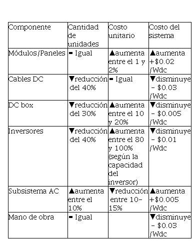 · Se pueden instalar inversores de mayor potencia (en el mercado los inversores con mayor potencia operan a 1500 VDC).