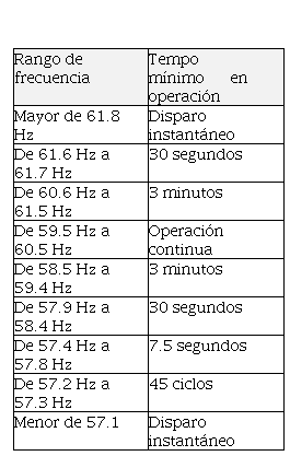 • En los casos de variaciones súbitas de frecuencia en el SIN, las Centrales se deberán desconectar del SIN, si la frecuencia es mayor de 62.0 Hz por más de 4 segundos, y si la frecuencia es menor de 57.0 Hz por más de 200 ms.