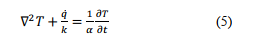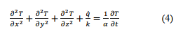 La variación de temperatura en 3 dimensiones espaciales al cuadrado en función del cambio de la temperatura con respecto al tiempo