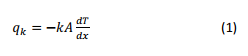 La medición de conductividad térmica se realizó en cinco materiales, dos de ellos comerciales (poliestireno expandido y gypsum con lámina de aluminio) y el resto, materiales base de fibras naturales y almidón de yuca(paja de arroz, bagazo de caña y estopa de coco). Para la medida de conductividad térmica se utilizó se un prototipo de medición de conductividad térmica, basado en la norma ASTM-C177 [14] y en la ley de Fourier de conducción de calor unidimensional. La ley de Fourier incorpora características mecánicas del proceso de transferencia de calor en una propiedad física conocida como conductividad térmica (k), del gradiente de temperatura (dT/dx) y el área (A):