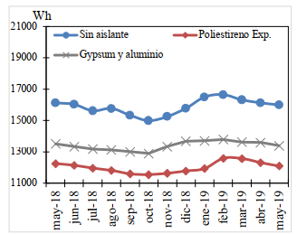 Para las medidas sin aislante, se tienen intervalos de consumos de entre 14,995 y 16,650 Wh, para el poliestireno expandido, los intervalos de medición oscilan entre 11,550 y 12,578 Wh, y para el gypsum, los intervalos de medición oscilan entre 12,900 y 13,793 Wh. Como resultado se tiene que el poliestireno expandido es el material que presenta un menor consumo de energía, con respecto al resto de condiciones evaluadas al colocarlo como aislante en ventanas