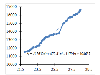 A partir de los datos obtenidos de consumo y temperatura en el recinto estudiado, se procedió a hacer un gráfico de Consumo vs Temperatura, como se muestra en la figura 7. De la línea de tendencia, se obtuvo una relación de tipo polinómica de tercer grado y el valor del coeficiente de determinación (R2) fue de 0.9892(ecuación 2).