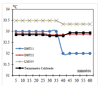 Las mediciones de temperatura en el exterior e interior del espacio estudiado se realizaron mediante el sistema JRMETER, con base en una plataforma Arduino y sensores de temperatura DHT22 [9]. Este sistema fue presentado en [10], y consiste en un sistema de análisis energético y de temperatura de las ventanas de un aula de clase con y sin aislamiento térmico, con la diferencia del cambio en el tipo de sensor empleado. Para la selección del sensor apropiado, se procedió a programar 3 tipos de sensores de temperatura, específicamente el LM335 [11], DHT11 [12] y DHT22 [9], a través de una conexión sencilla mediante Arduino. Cada sensor midió temperatura durante una hora. Se observó la estabilidad de las mediciones captadas y con un termómetro digital calibrado CIE 305/307, se comprobaron los valores de temperatura obtenidos. En la figura 3 se puede apreciar que las temperaturas medidas por el sensor DHT22 se aproximan a los valores obtenidos con el termómetro calibrado.