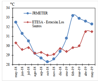 Para este estudio, se consideraron temperaturas promedio mensuales, ya que la temperatura no varía de manera significativa durante un mes, de acuerdo a los datos presentados por ETESA para los años 2018 y 2019[7]. Esto permitió simplificar el análisis de datos, así como su representación gráfica. En la figura 4 se presentan los valores de temperatura exterior promedio, correspondiente a la temperatura ambiental de cada uno de los meses estudiados, tanto los registrados por el JRMETER, como los valores proporcionados por ETESA, en la Estación de Los Santos [7]