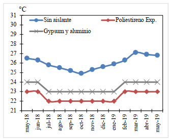 Por otra parte, se realizaron mediciones de temperaturas en el interior del recinto, considerando tres casos: sin aislamiento en las ventanas y aislando las mismas con materiales comerciales como el gypsum y el poliestireno expandido (ver figura 5). En la gráfica se presentan los valores promedios de las temperaturas interiores medidas a lo largo del año de prueba.