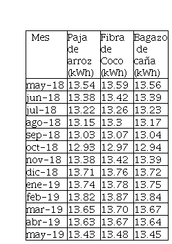 Una vez expresada la ecuación (2), que relacionó la temperatura, el consumo (potencia) y el coeficiente de conductividad térmica, esta debe ser capaz de satisfacerlas necesidades y de predecir el consumo energético y su relación con la medida de conductividad térmica de materiales con potencial para aislar. De la relación de predicción (2) se pudieron obtener valores para los siguientes materiales naturales, que son considerados como desechos agroindustriales y que a su vez fueron caracterizados térmicamente con el medidor de conductividad térmica creado.