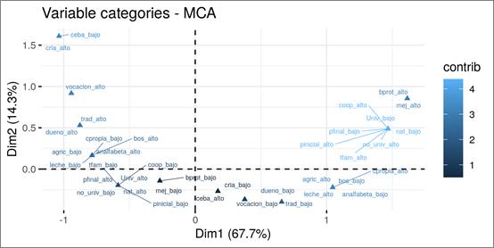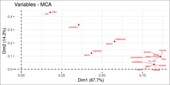 Los resultados del MCA demostraron que la crianza de animales de cría y ceba tuvieron mayor relación con la vocación de los propietarios. En este grupo, los individuos tuvieron un nivel de educación más elevado, participaron de cooperativas y usaron en menor proporción la mano de obra familiar.