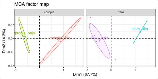La estimación de la interrelación entre las variables evaluadas fue realizada usando los paquetes FactoMineR (Lê, Josse, y Husson, 2008) y factoextra (Kassambara y Mundt, 2017). Todas las variables fueron divididas en clases, tratándolas de forma binomial (categorías baja y alta) en un Análisis en Componentes Múltiples (MCA) con el uso de computación estadística (R Core Team, 2020).