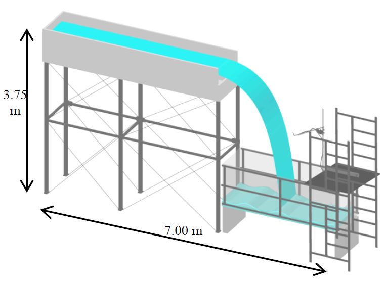La Universidad Politécnica de Cartagena (UPCT) dispone de una instalación experimental especial para el estudio de chorros rectangulares turbulentos y de cuencos de disipación de energía. La instalación está ubicada en el Laboratorio de hidráulica de la UPCT, y ésta dispone de un canal de ingreso de 4.00 m de largo, 1.05 m de ancho y 1.0 m de alto. En la parte aguas abajo del canal existe un vertedero rectangular de cresta delgada con alturas de caída variable. En la Figura 1 se puede apreciar una vista tridimensional de la instalación experimental para el estudio de chorros turbulentos.