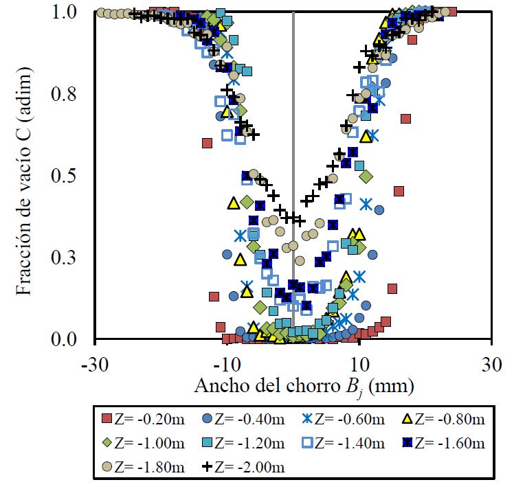 Para los perfiles Z > -1.40 m se inicia la aireación del chorro y el núcleo de agua desaparece. Conforme avanza las alturas de caída, la aireación en la parte central del chorro aumenta hasta llegar a fracciones de vacío del orden de C = 0.40.