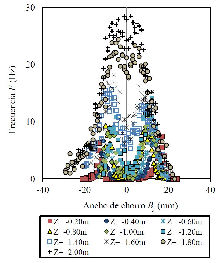 Al inicio del descenso del chorro (Z = -0.20 m) los valores de frecuencia de interferencia son cercanos a cero, sin embargo, para puntos más bajos (Z = -2.0 m) las fracciones de vacío registran valores altos de frecuencia de interferencia; esto debido a que el núcleo desaparece y la aireación se incrementa.