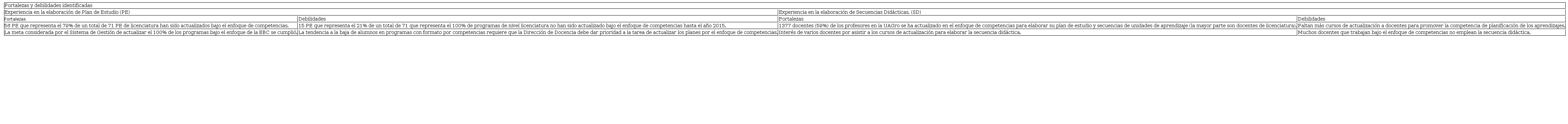 Una analogía entre los períodos de 2003-2008 y de 2009-2015, refleja que, en el primer período, no se atendía al asesoramiento para elaborar planes de estudio y secuencias didácticas bajo el enfoque de competencias, sin embargo, los resultados obtenidos reflejan que cuando la UAGro se propone realizar proyectos para mejorar en la elaboración y actualización de sus planes de estudio, estos, se realizan. Falta mucho por hacer, las metas se deben cumplir, actualizar al 100% de los planes de estudio de licenciatura se dice fácil, pero se requiere de un gran esfuerzo. Es importante reconocer la labor que lleva a cabo la Dirección de Docencia de la UAGro y su grupo asesor porque sin ellos, estos resultados no serían posibles. Queda pendiente seguir insistiendo a los comités de diseño curricular y a los profesores para que se sumen a la propuesta.