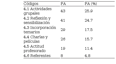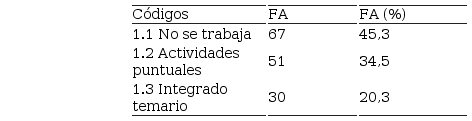 Esta categoría es reveladora del modo en que se había trabajado la temática objeto de estudio en las aulas de los participantes. Su análisis permite comprobar la existencia de tres matices claramente diferenciados, de los que se deriva la propuesta de códigos, cuyos datos descriptivos quedan recogidos en la tabla 1.