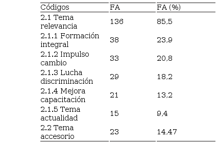 Este código aglutina una serie de subcódigos que justifican la defensa del alumnado del trabajo de esta temática en la educación superior. Entre sus argumentos figuran: 2.1.1 Formación integral, 2.1.2 Impulso cambio, 2.1.3 Lucha discriminación, 2.1.4 Mejora capacitación y 2.1.5 Tema actualidad.