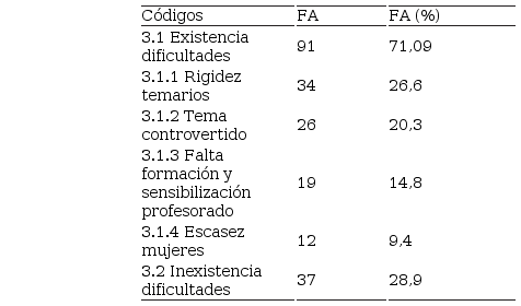 Considera las aportaciones en las que los participantes identifican la existencia de una serie de dificultades. Entre ellas: 3.1.1 Rigidez temarios, 3.1.2. Tema controvertido, 3.1.3 Falta formación y sensibilización profesorado y 3.1.4 Escasez mujeres.