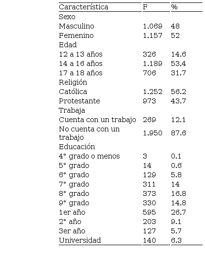 Se sondearon variables que pudiesen incidir directa o indirectamente en la salud sexual y reproductiva de la adolescencia, como la religión y el trabajo; y, en congruencia con la edad de la población, apareció que solamente el 12,1 % de los participantes cuentan con un empleo.