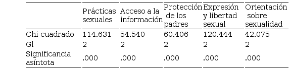 Se realizó una prueba de tipo U de Mann-Whitney para determinar la existencia de diferencias significativas por cada una de las dimensiones del estudio, de acuerdo con su sexo biológico. Al realizarse la prueba, aparecieron diferencias estadísticamente significativas para todas las variables medidas, es decir, el sexo es determinante en la percepción y realización de prácticas sexuales (p = 0.00), el acceso que se tiene a la información (p = 0.00), el tipo de protección que se recibe de los padres (p = 0.00), la expresión y libertad sexual (p = 0.47) y la orientación sobre sexualidad que se recibe (p = 0.00).
