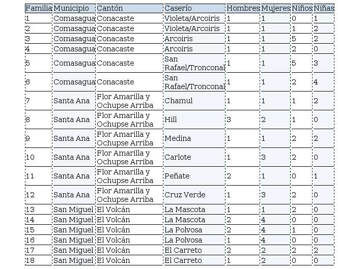 Asimismo, ha sido ejemplar la implicación de los ayuntamientos, cuyos municipios se han visitado (Comasagua, Santa Ana y San Miguel), en la realización del trabajo de campo. En todos los casos el equipo de investigación ha sido acompañado por uno o varios miembros del personal municipal, facilitando sobremanera la realización del trabajo realizado.