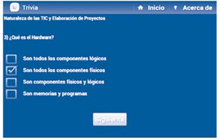 En esta pantalla aparecen las distintas unidades de la asignatura. El usuario debe seleccionar la unidad correspondiente. Cada unidad es dependiente de la anterior, es decir, funciona como si fueran niveles. La unidad 1 no tiene prerrequisitos; pero para acceder a las demás unidades, el usuario debe haber cumplido el número de puntos mínimos para avanzar a la siguiente unidad. Los puntos mínimos para pasar a otro nivel son 8.