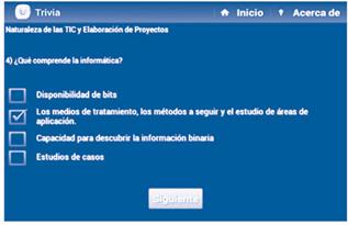 Cuando ya se tienen los resultados y el análisis de la información, ahora se cuenta con las bases para desarrollar la aplicación que permita utilizar los dispositivos móviles como herramienta de apoyo en la educación media. En el año 2012, entre los meses de marzo y mayo, se obtiene el plan de estudio de la asignatura de Informática para educación media; con base a este plan se desarrolló un test que incluyó todos los contenidos de la asignatura. Se finalizó la aplicación en el mes de octubre de 2012.