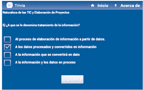 A los estudiantes de educación media les gustaría utilizar su dispositivo móvil para retroalimentar sus clases. La mayoría considera que la asignatura de Informática es la ideal, y entre las aplicaciones que prefieren para aprender señalan las trivias y los juegos. Este aspecto se consideró al momento de desarrollar la aplicación móvil.