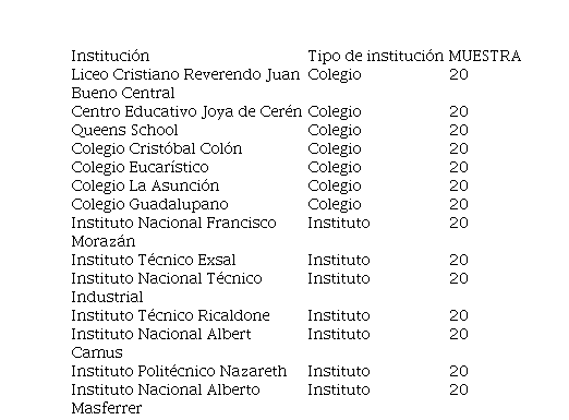 El proceso de recolección de datos se realizó en centros de estudio de educación media en el departamento de San Salvador, en la zona metropolitana del municipio de San Salvador. Se seleccionaron aleatoriamente catorce centros de estudio; de cada uno se encuestaron veinte estudiantes de entre 15 a 22 años, teniendo un total de 280 encuestados. A continuación, se presenta el listado de las instituciones encuestadas.