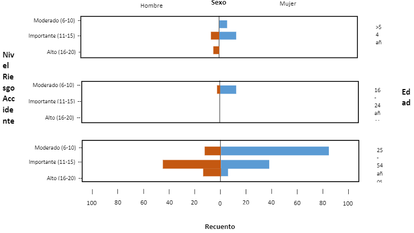 En la figura 1 muestra la relación entre el nivel de riesgo, el sexo y la edad, observando que en su mayoría la edad que comprende entre 25 y 54 tiene más riesgo, y los hombres tienen mayor riesgo importante y alto.