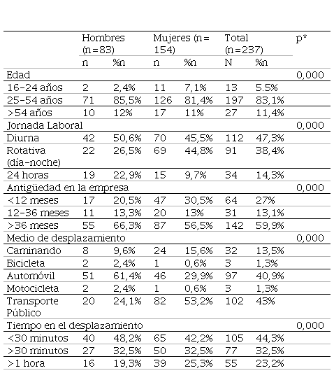 Características generales, laborales y de desplazamiento de los trabajadores (n=237)