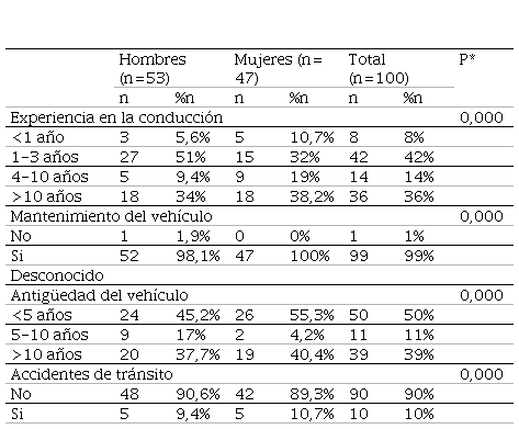 En la tabla 2 se encuentran los datos de los trabajadores que utilizaron automóvil o motocicleta, teniendo un número de 100 encuestados. En la experiencia en la conducción no se observan diferencias. El 99% de los trabajadores que emplean automóvil o motocicleta realizan un mantenimiento periódicos de sus vehículos.