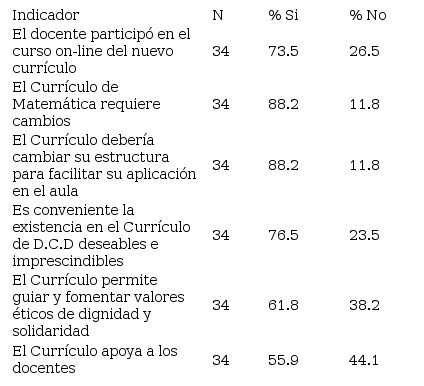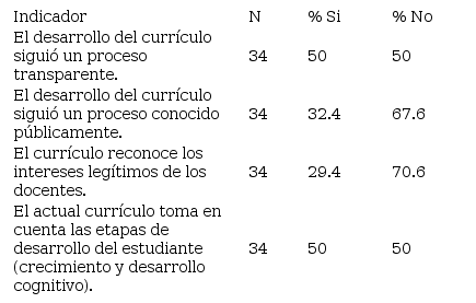 Una vez concluida la organización de la información y el procesamiento de los datos de la muestra, se obtienen las principales observaciones respecto al desarrollo o realización del actual currículo (Ver Tabla 1).