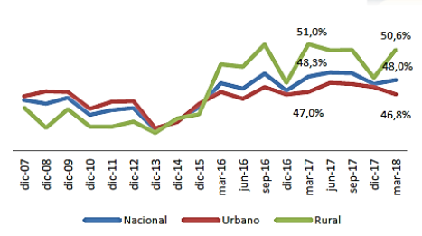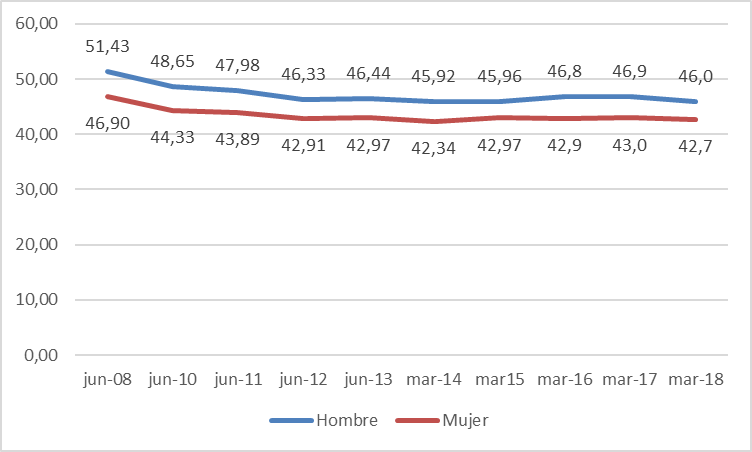 Al momento en el país, la tasa de participación bruta (porcentaje que resulta del cociente entre la población económicamente activa - PEA y la población total PT); ver fórmula 1 para su cálculo [18, p. 9], no presentó variaciones estadísticas significativas entre marzo de 2017- marzo 2018, ubicándose en un 48,0%, a nivel urbano fue de 46,8% y a nivel rural de 50,6%. (ver figura 2) [18, p. 4]; esto significa que, el aporte de la población económicamente activa en el Ecuador llega a casi el 50% de la participación total en referencia de la población; sin embargo, este dato no arroja información relevante correspondiente a la información de la TPB por género.