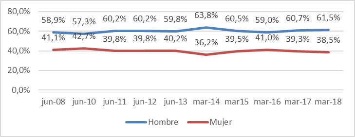 Los indicadores históricos de empleo, subempleo y desempleo dan cuenta de estas inequidades, [ 7] [ 20] [ 21] como resultado de la reproducción de estereotipos asignados desde el seno de una cultural patriarcal y masculinizada, y a la falta de aplicación de las políticas de empleabilidad no diferenciada entre hombres y mujeres. Un dato importante a tomar en consideración es el aumento del desempleo en las mujeres, mientras que los hombres cuentan, con más y mejores oportunidades laborales y salariales. Si el panorama laboral no se modifica, de nada servirá el establecimiento de leyes que intenten restituir los espacios en los que las mujeres han sido históricamente excluidas.