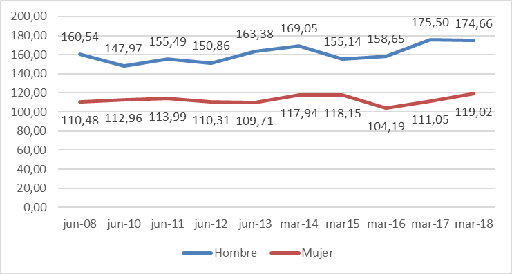 Promedio mensual de ingreso por empleo y empleo adecuado diferenciado por géneros, denotan de la misma manera una asignación de salarios discriminatoria para las mujeres. Ver Figuras 5 y 6 [ 17].