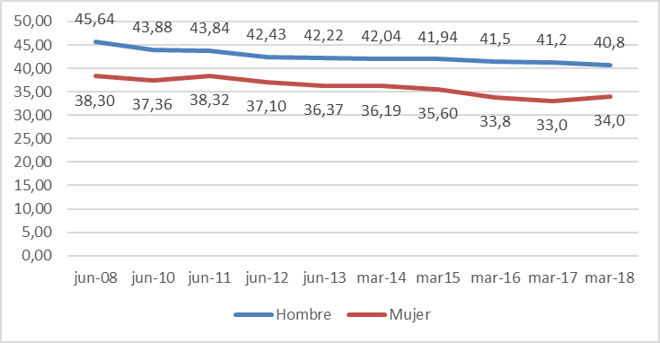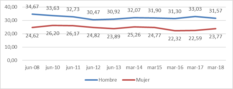 El desempleo [ 17, p. 4] por género se ha reducido significativamente en los hombres en los últimos 4 años, mientras que el desempleo en las mujeres se ha incrementado casi 6 puntos porcentuales en las mujeres en el mismo período de tiempo, esto a pesar de los intentos de los organismos de control públicos de garantizar la igualdad de condiciones y empleabilidad entre hombres y mujeres; muchas son las propuestas y cambios realizados en este ámbito, sin embargo, estos no son visibles en los indicadores de desempleo del país. Ver Figura 12 - [ 17]