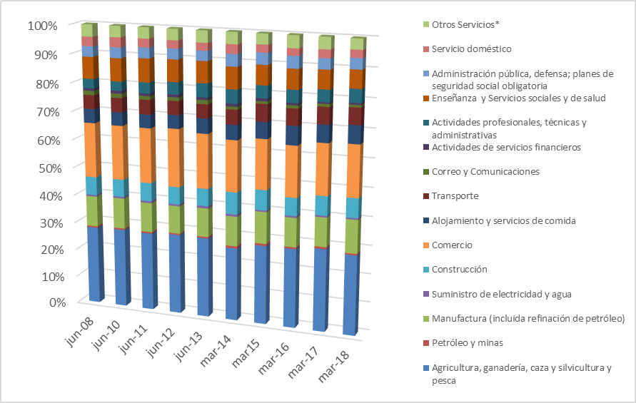 Las ramas de actividad con mayor participación en el sector productivo son: 1) Agricultura, ganadería, caza y silvicultura y pesca, 2) Manufactura (incluida refinación de petróleo), 3) Comercio y, 4) Enseñanza y Servicios sociales y de salud. Ver Figura 1 - [ 17]
