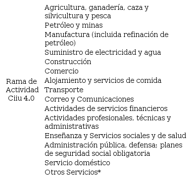 Las ramas de la actividad productiva donde se encuentra la Población Económicamente Activa - PEA (Personas en edad de trabajar que se encuentran empleadas o desempleadas), corresponden a las siguientes, ver tabla 1- [ 17]: