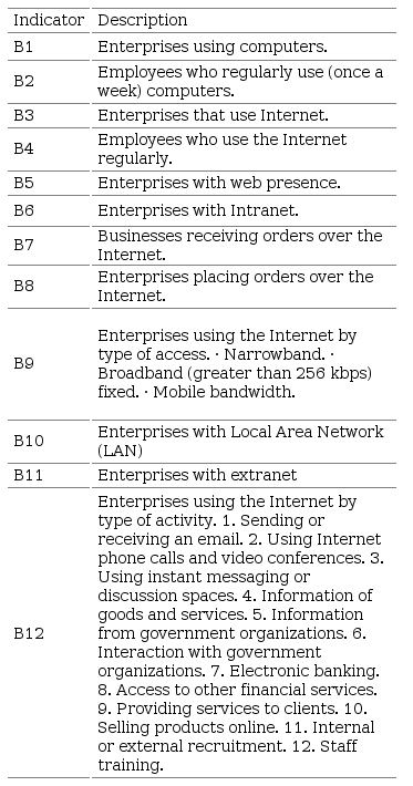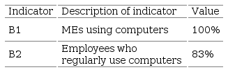 To determine the status of use of ICT in MEs, in this research we worked with key indicators on ICT use in enterprises. These indicators have been proposed by the Observatory for the Information Society in Latin America and the Caribbean (OISLAC) [ 8]. The set of 12 evaluated indicators shown in table 1.