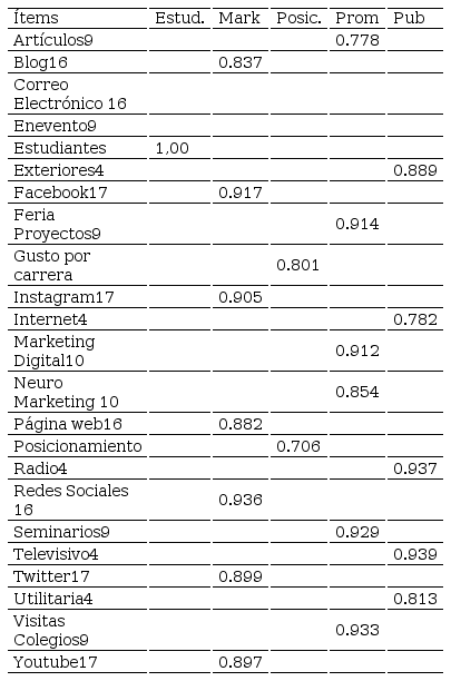 El desarrollo de un patrón de comunicaciones, el mismo que fue mediante el modelo de ecuaciones estructuradas basadas en mínimos cuadrados (PLS- SEM), determinó que el modelo debe constar de tres variables principales para lograr el posicionamiento de la Carrera de Mercadotecnia, siendo estas; las estrategias de publicidad, por medios de exteriores, radio, televisión y utilitaria, mientras que en marketing interactivo las redes sociales más influyentes son: Facebook, Instagram, YouTube y Twitter, así como la utilización de blogs y páginas web de la Carrera, en lo que concierne a promoción de ventas se utiliza eventos, como ferias de proyectos, visitas a los colegios, artículos promocionales, seminarios, y capacitaciones como marketing digital y neuroventas.