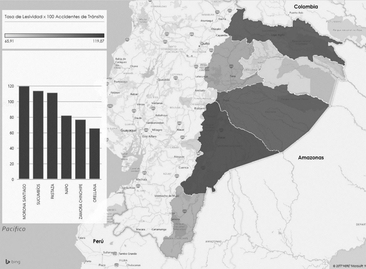 Amazónica por cada 100 accidentes de tránsito se registraron 98 víctimas con lesiones y 24 fallecidos. Las provincias con mayor lesividad por accidentes de tránsito fueron Morona Santiago (120 lesionados x100 AT) y Sucumbíos (114 lesionados x100 AT), con respecto a los fallecidos, Sucumbíos (56 fallecidos x 100 AT) y Orellana (45 fallecidos x 100 AT), Figuras 1 y 2.