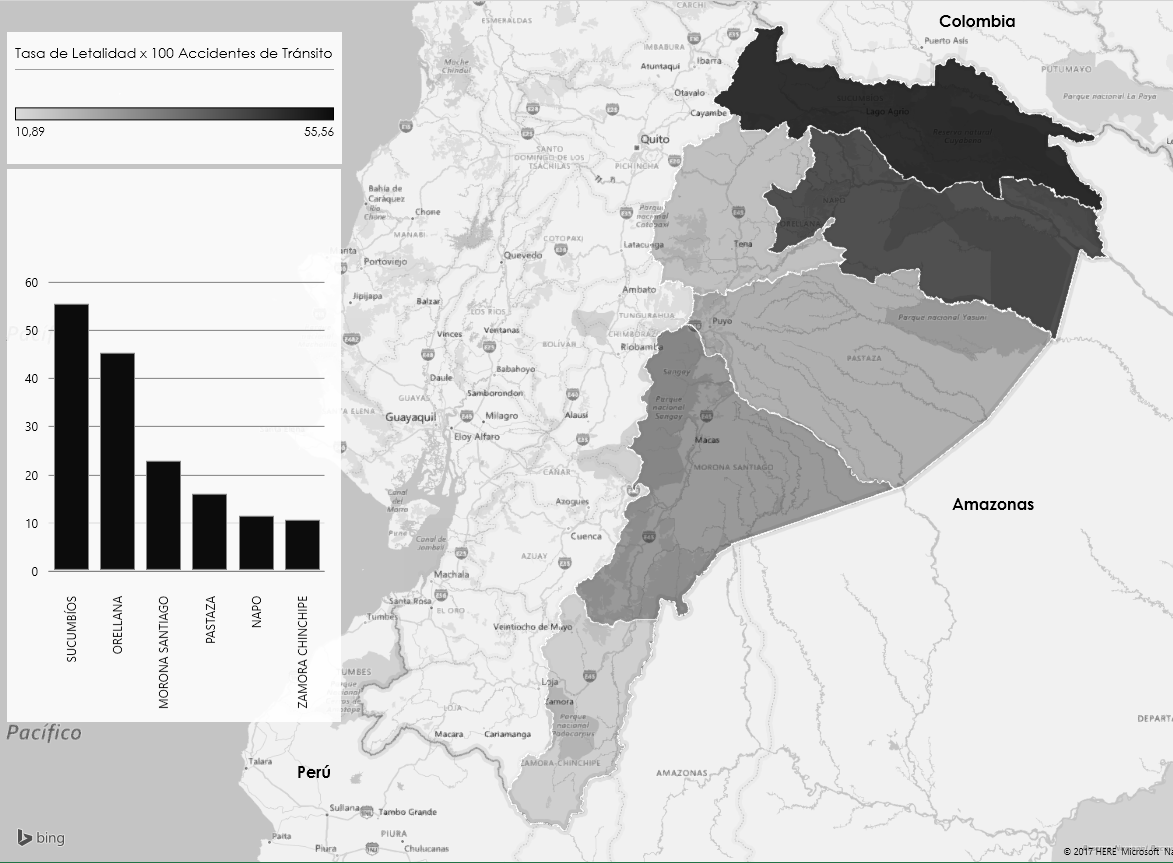 El análisis y distribución geoespacial de los accidentes de tránsito y estadísticas de la población de la Región Amazónica del Ecuador permitió determinar las provincias y cantones con mayores tasas de lesividad y mortalidad.