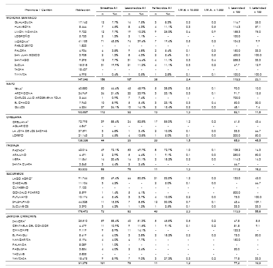La información analizada permitió calcular la tasa de mortalidad bruta (x10.000 habitantes) por provincia y ajustada (x1.000 habitantes) por cantón, a partir del censo poblacional del Instituto Nacional de Estadística y Censos [ 1]. Así mismo, se calcularon las tasas de lesividad; (nº de lesionados en accidente de tránsito) x (100) / (nº de total de accidente de tránsito), y las tasas de letalidad; (nº de fallecidos en accidente de tránsito) x (100) / (nº de total de accidente de tránsito) por provincia de la Región Amazónica; Morona Santiago, Napo, Orellana, Pastaza, Sucumbíos, Zamora Chinchipe