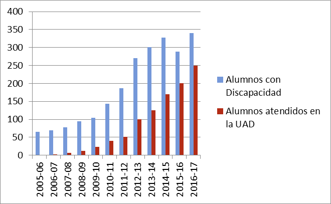 Desde el año 2006 la Universidad Rey Juan Carlos a través de la Unidad de Atención a Personas con Discapacidad, ha ido incrementando considerablemente el número de alumnos atendidos desde este servicio. Este incremento, es una consecuencia directa de los avances en los procesos de inclusión educativa en etapas educativas anteriores, y aunque como decíamos antes, aún queda mucho camino por recorrer, los datos que se muestran a continuación indican que el proceso de inclusión y una adecuada atención a la diversidad no solo es posible en etapas educativas obligatorias sino también en estudios superiores.