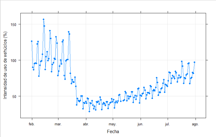 El 11 de marzo de 2020 la Organización Mundial de la Salud declara pandemia al SARS-CoV-2 (Covid-19), posteriormente, el Gobierno Federal mexicano publicó el acuerdo de medidas preventivas para la mitigación y control de riesgos el 24 de marzo, pero fue hasta el 2 de abril que se implementó el semáforo epidemiológico el Estado de México (Secretaría de Salud, 2020). Se puede observar en la gráfica 1 que la población comenzó a disminuir drásticamente su movilidad a partir del 15 de marzo y para el 31 de julio los niveles de intensidad de uso de vehículos comienzan a elevarse sin llegar a los valores previos a la pandemia.