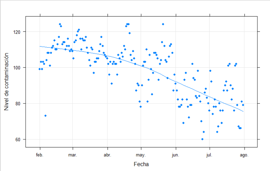 Cabe mencionar que para este estudio se hicieron análisis de regresiones con el fin de modelar y/o investigar si existe alguna relación entre las variables de los contaminantes y la intensidad de uso de automóviles de febrero a julio 2020. Es decir, la variable dependiente a considerar fue el porcentaje de intensidad y las variables independientes los valores de los contaminantes. Al aplicar el modelo de regresión lineal y tomando en cuenta que todos los valores p de las variables independientes fueron mayores a 0.01 y el coeficiente de determinación R2 fue de 0.4606; lo cual indica que no existe una relación significativa entre las variables.