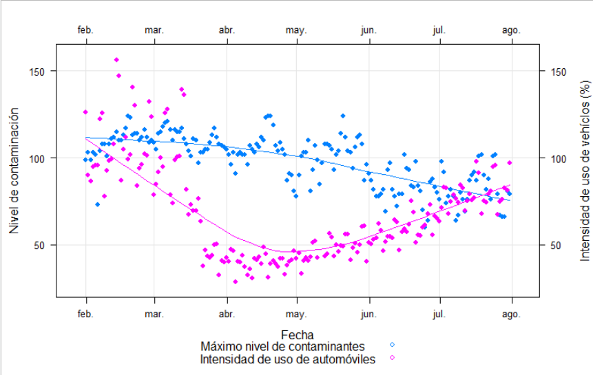 El análisis de los datos de calidad del aire en conjunto con la información de movilidad urbana permitió establecer que no existe una correlación directa entre la densidad del uso del automóvil y los niveles de los contaminantes ambientales. Los factores de contaminación (O3, SO2, NO2, CO, PM10 y PM2.5) en la ciudad no decrecieron como se esperaba durante la contingencia sanitaria. Esto puede ser debido al crecimiento económico de la ciudad en ausencia de medidas efectivas para el control de las emisiones causadas por las fuentes fijas y móviles.